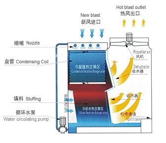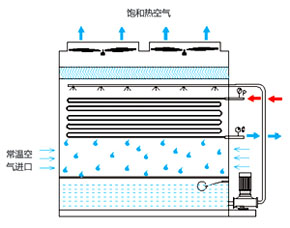 工作流體(水,油或其他液體)在盤管中流動(dòng),盤管外壁被噴淋水包裹,流體的熱量通過(guò)管壁傳遞,與水和空氣行程飽和濕熱蒸汽,熱量由風(fēng)機(jī)排入大氣,噴淋水在循環(huán)的過(guò)程中通過(guò)PVC散熱片降低溫度,與新鮮入風(fēng)形成風(fēng)水同向流動(dòng),盤管主要依靠濕熱熱傳導(dǎo)方式,這樣的運(yùn)行原理的重要特點(diǎn)就是可能抑制盤管外壁的水垢生成。